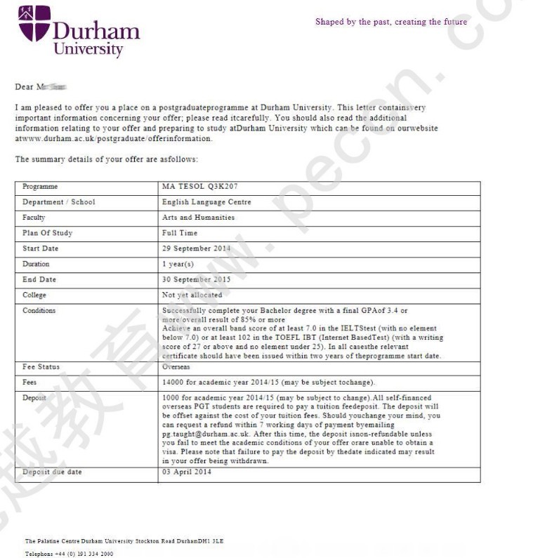 恭喜優(yōu)越教育成功幫助這位孫同學(xué)申請到杜倫大學(xué)“對外英語教育”專業(yè),歡迎隨時在線咨詢優(yōu)越教育,我們的客服24小時在線,感謝您的咨詢!