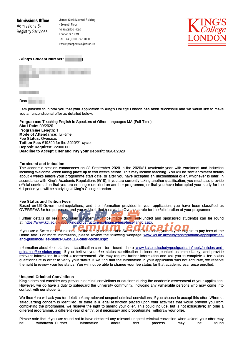 2020offer:恭喜宋同學(xué)獲得倫敦國王學(xué)院對(duì)外英語教學(xué)專業(yè)碩士通知書