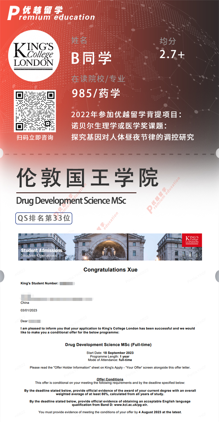 2023offer:恭喜白同學獲得倫敦國王學院藥物開發科學碩士通知書