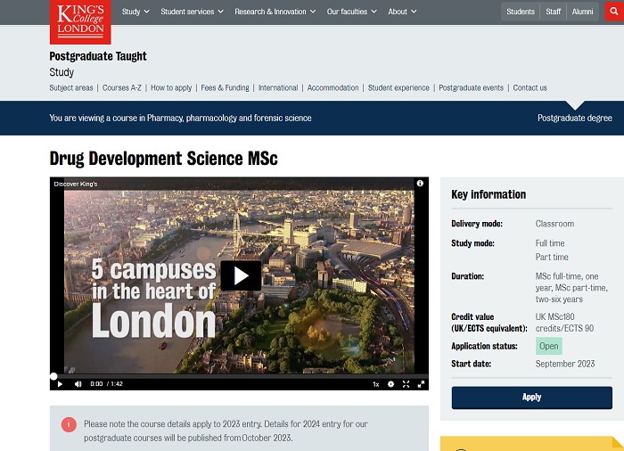 21/22學年,此專業錄取率達74%。23fall的錄取要求為醫學學位,藥學、藥理學、生物學、生物化學、化學或相關學科的 2:1 第一學位,或海外同等學力。雅思總分最低要求6.5分,單項不低于6.0。