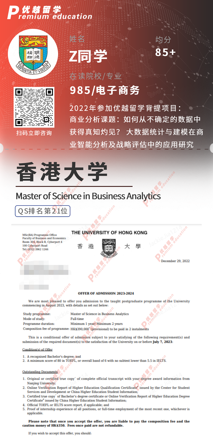 2023offer:恭喜Z同學在碩士留學申請中獲得香港大學商業分析碩士通知書