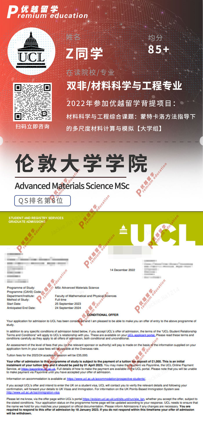 2023offer:恭喜Z同學獲得UCL高級材料科學專業碩士通知書。