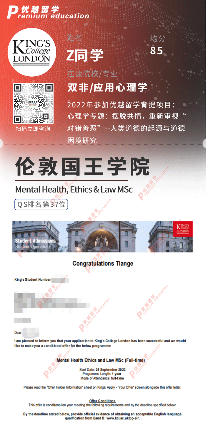 2023offer:恭喜Z同學在碩士留學申請中獲得KCL心理健康、倫理與法律碩士通知書!