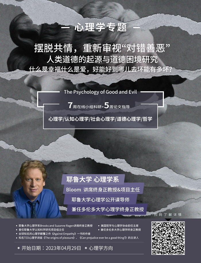 2.本項目旨在為學生講述“道德思想與道德行為”的現代科學研究內容。在導師的引領下,學生將思考幾個主要的道德認知問題,如:為什么我們有能力做到超然的善良或難以言喻的殘忍?我們如何解釋部分人們對墮胎、同性婚姻、平權行動、吃肉和酷刑的與生俱來的強烈觀點?人類進化、文化發(fā)展和宗教事務是如何共同塑造我們的道德本性的?