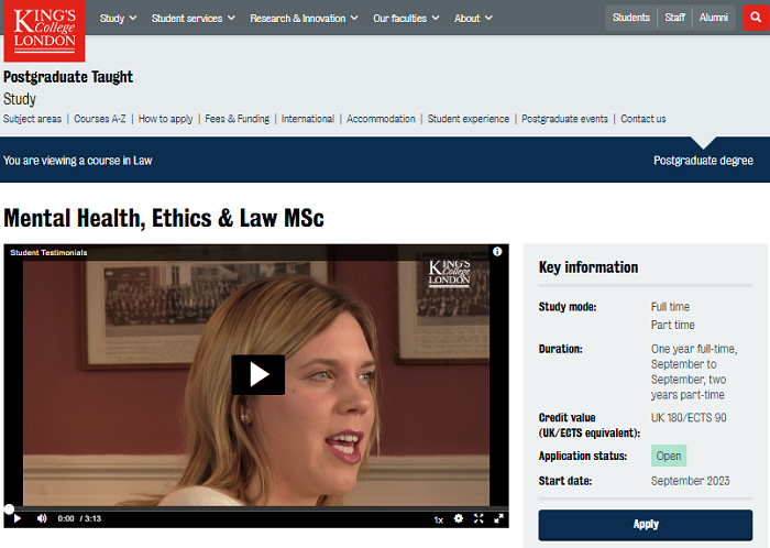 心理健康、倫理和法律理學碩士課程由兩個國際公認的卓越中心提供,并提供綜合的、高度跨學科的心理健康、倫理和法律教育。它幫助畢業(yè)生成為醫(yī)療保健、心理健康法律或政策方面的領導者。該計劃的學生將有獨特的機會與來自倫敦法律和精神病學世界中心的廣泛學術和專業(yè)學科的其他人一起學習。