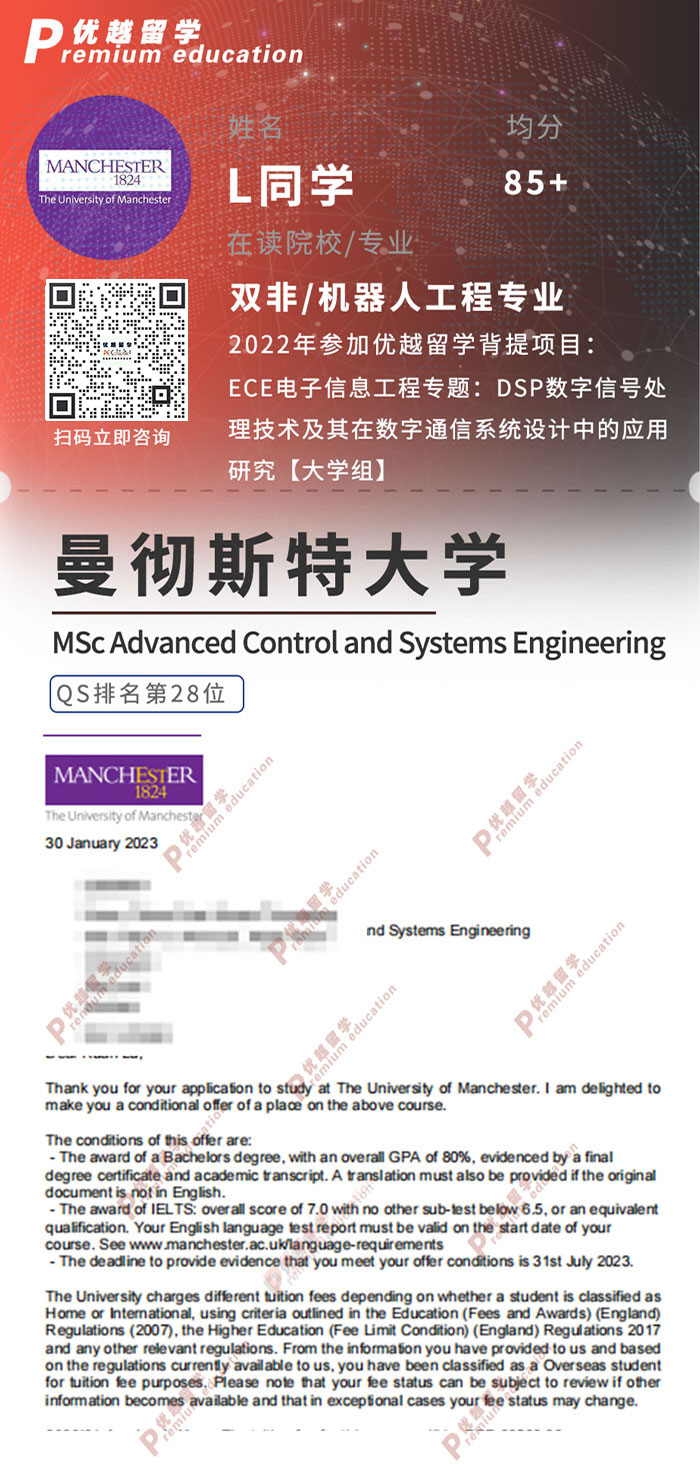 2023offer:恭喜L同學(xué)在碩士留學(xué)申請(qǐng)中獲得曼徹斯特大學(xué)高級(jí)控制與系統(tǒng)工程碩士通知書!
