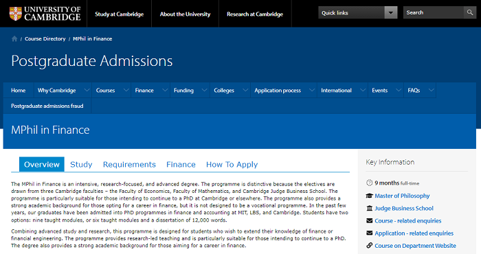 金融碩士是一個(gè)密集的以研究為重點(diǎn)的高級(jí)學(xué)位。該課程的特殊之處在于,選修課來(lái)自三個(gè)劍橋?qū)W院——經(jīng)濟(jì)學(xué)院、數(shù)學(xué)學(xué)院和劍橋賈奇商學(xué)院。該計(jì)劃特別適合那些打算繼續(xù)在劍橋或其他地方攻讀博士學(xué)位的人。該項(xiàng)目還為那些選擇金融職業(yè)的人提供了強(qiáng)大的學(xué)術(shù)背景,但它并不是一個(gè)職業(yè)項(xiàng)目。在過(guò)去的幾年里,該項(xiàng)目的畢業(yè)生被麻省理工學(xué)院、倫敦商學(xué)院和劍橋大學(xué)的金融和會(huì)計(jì)博士項(xiàng)目錄取。學(xué)生有兩種選擇:九個(gè)教學(xué)模塊,或六個(gè)教學(xué)模塊和一篇12,000字的論文。