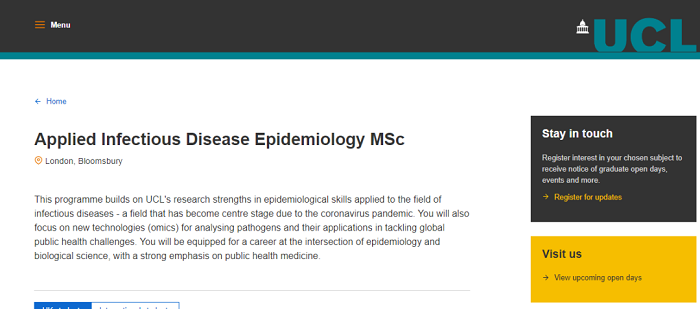 該項(xiàng)目建立在倫敦大學(xué)學(xué)院在傳染病領(lǐng)域應(yīng)用流行病學(xué)技能的研究?jī)?yōu)勢(shì)之上——由于冠狀病毒大流行,該專業(yè)領(lǐng)域已經(jīng)成為關(guān)注的重心。學(xué)生還將專注于分析病原體的新技術(shù),來應(yīng)對(duì)全球公共衛(wèi)生的問題。畢業(yè)生能夠從事流行病學(xué)和生物科學(xué)交叉領(lǐng)域的職業(yè),重點(diǎn)是公共衛(wèi)生醫(yī)學(xué)。