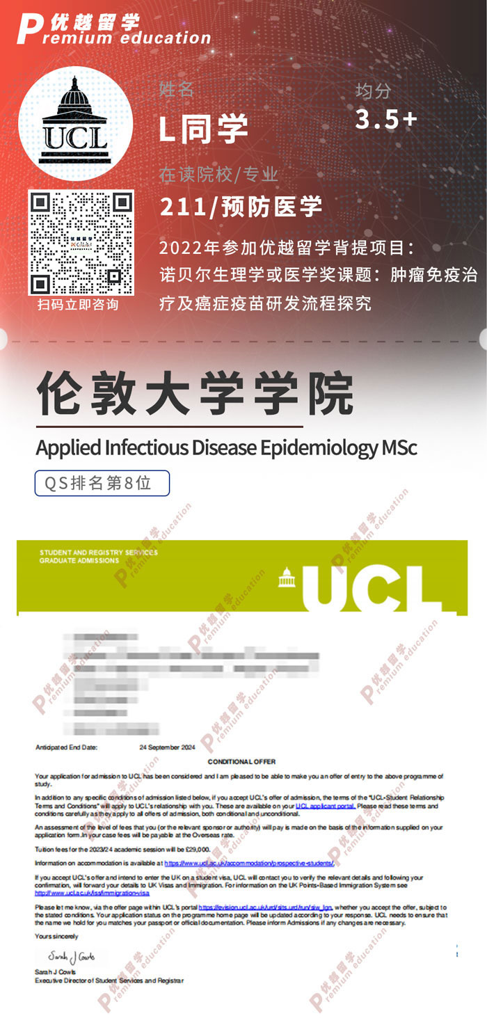2023offer:恭喜L同學(xué)在碩士留學(xué)申請(qǐng)中獲得UCL應(yīng)用傳染病流行病學(xué)理學(xué)碩士通知書!