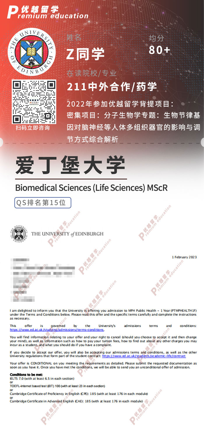 2023offer來襲!恭喜Z同學在碩士留學申請中斬獲愛丁堡大學生物醫學科學碩士通知書!