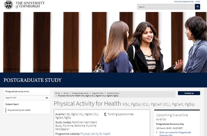 身體活動不足是全世界死亡的主要危險因素。世界各地成年人和青少年缺乏運動的程度很明顯,這使得缺乏運動成為一種流行病和全球公共衛生問題。MSc Physical Activity for Health 向應屆畢業生、醫學生和現有的國內和國際勞動力開放。它旨在提供一系列學科的體育活動和公共衛生領域的研究生水平學術培訓,包括:體育與運動科學、健康科學、心理學、流行病學、生理。該項目是蘇格蘭該領域唯一的專門研究生學位。該計劃由國際知名的體育鍛煉健康研究中心的成員指導和實施。此課程的教學活動與正在進行的世界領先研究密切相關,學生將從活躍于該領域的研究人員那里獲得教學和指導。
