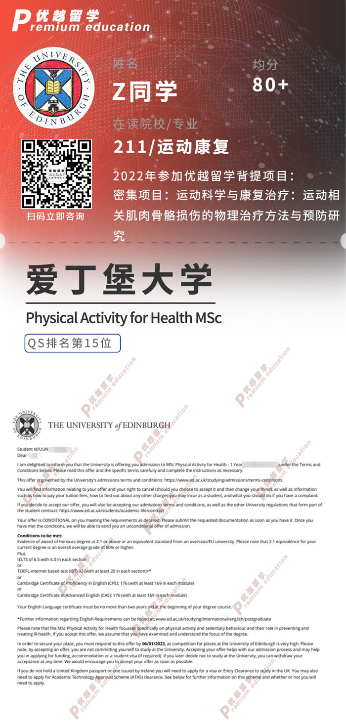 2023offer來襲!恭喜Z同學在碩士留學申請中斬獲愛丁堡大學健康體育活動碩士通知書!