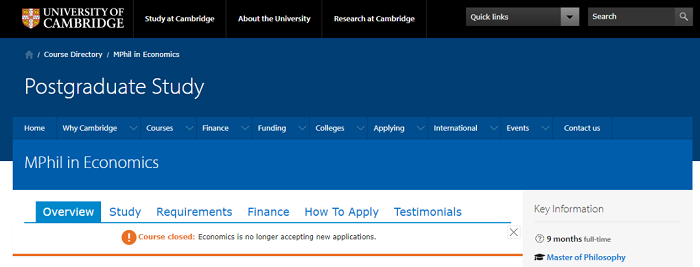 經濟學院學術要求高,符合要求的申請者眾多。申請人應已獲得或期望獲得經濟學高二等本科(或國家同等學歷)資格。該學位應包括中級微觀經濟學、宏觀經濟學和計量經濟學的標準課程(商業研究、會計學或管理學學位或資格證書不能提供足夠的背景)。如果不符合以下的標準,則不太可能獲得名額。