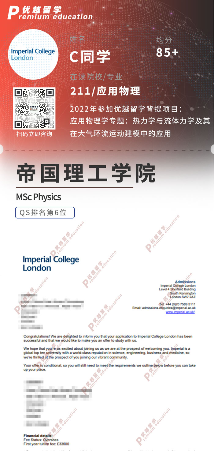 2023offer來襲!恭喜C同學在碩士留學申請中斬獲帝國理工學院物理學碩士錄取通知!