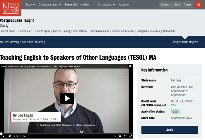 TESOL是 Teaching English to Speakers of Other Languages 的縮寫,中文翻譯是“對外英語教學”。TESOL的教學對象是英語非母語的人(如日本人、中國人、法國人等等)。KCL的TESOL該課程提供對英語語言教學中當前研究、理論、原則和實踐的全面介紹。它將使學生獲得一系列將英語作為第二語言/外語進行教學的實用技能,并使你做好獨立和批判性地參與當前語言教學和研究問題的準備。該課程提供調查語言學習所需的研究技能,并且工具可幫助反思實踐并發展你的個人教學法。難得的不要求工作經驗,很適合國內無教學經驗的英語專業的應屆本科生。