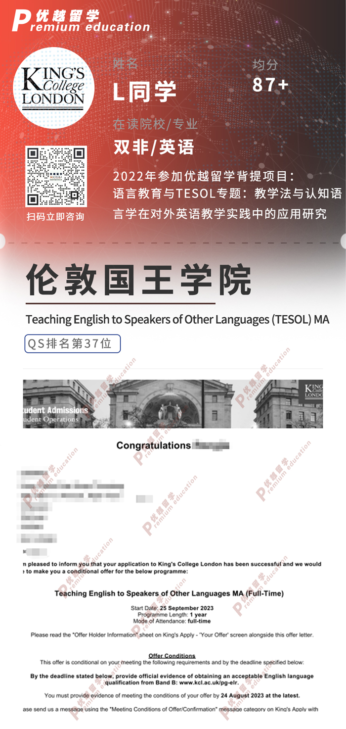 2023offer來襲!恭喜L同學在碩士留學申請中斬獲倫敦國王學院TESOL碩士錄取通知!