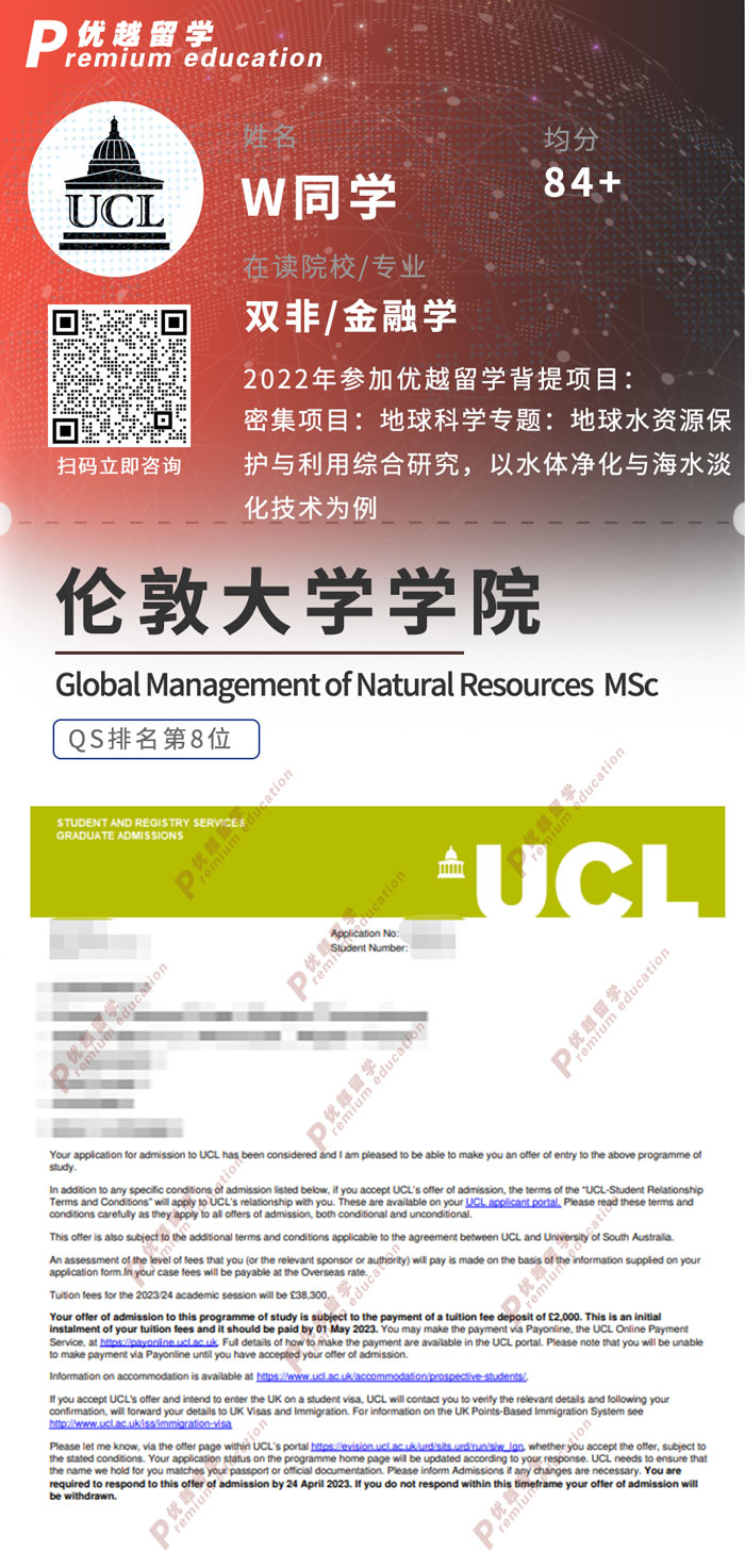 2023offer來襲!恭喜W同學在碩士留學申請中斬獲倫敦大學學院全球自然資源管理碩士通知書!