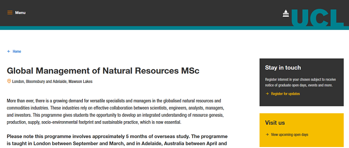 全球自然資源管理碩士由倫敦大學學院的化學工程學院、地球科學學院、巴特萊特建筑學院、管理學院和南澳大學未來工業學院合作提供。該項目的學生將有機會精通自然資源行業的多個方面。他們將有機會發展適當的研究技能,優秀的溝通技能,更好地管理實踐,成就跨越自然資源部門的職業生涯。