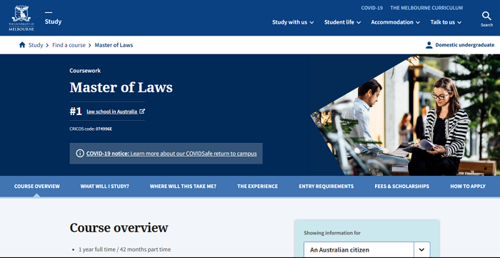 法律碩士(LLM)是世界知名的墨爾本法律碩士項目的旗艦學位,為學生提供了幾十個專業法律領域的170多個科目的選擇。