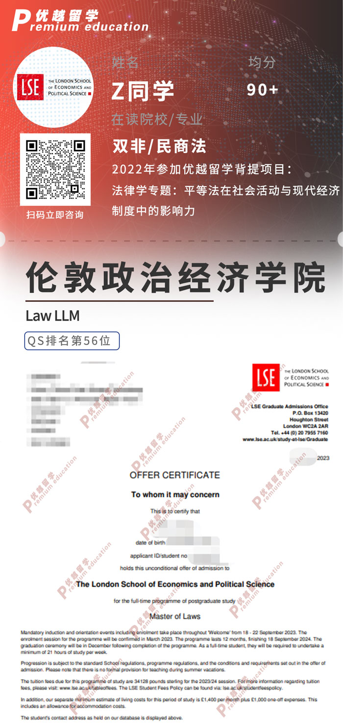 2023offer來襲!恭喜Z同學(xué)在碩士留學(xué)申請中斬獲LSE法律碩士通知書!