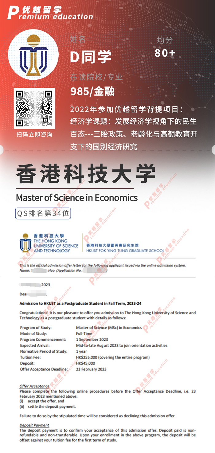 2023offer來襲!恭喜D同學(xué)在碩士留學(xué)申請(qǐng)中斬獲香港科技大學(xué)經(jīng)濟(jì)學(xué)碩士通知書!