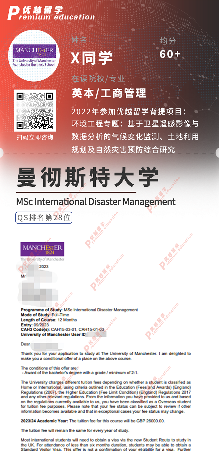 2023offer來襲!恭喜X同學在碩士留學申請中斬獲曼徹斯特大學國際災害管理碩士通知書!