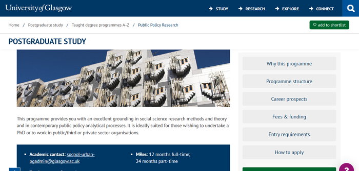 無論是為了在公共與志愿部門進(jìn)行工作還是為了一步攻讀博士學(xué)位,該計劃為公共政策的高級研究提供了堅實(shí)的基礎(chǔ)。學(xué)生在格拉斯哥的城市環(huán)境中研究公共政策理論和實(shí)踐,可以直接參與我們這個時代許多最緊迫的公共政策問題,并為這些問題而制定解決方案。課程將去倫敦實(shí)地考察受矚目的房地產(chǎn),以及規(guī)劃和再生項目。讓學(xué)生深入了解城市建設(shè)和設(shè)計的復(fù)雜社會經(jīng)濟(jì)動態(tài)。