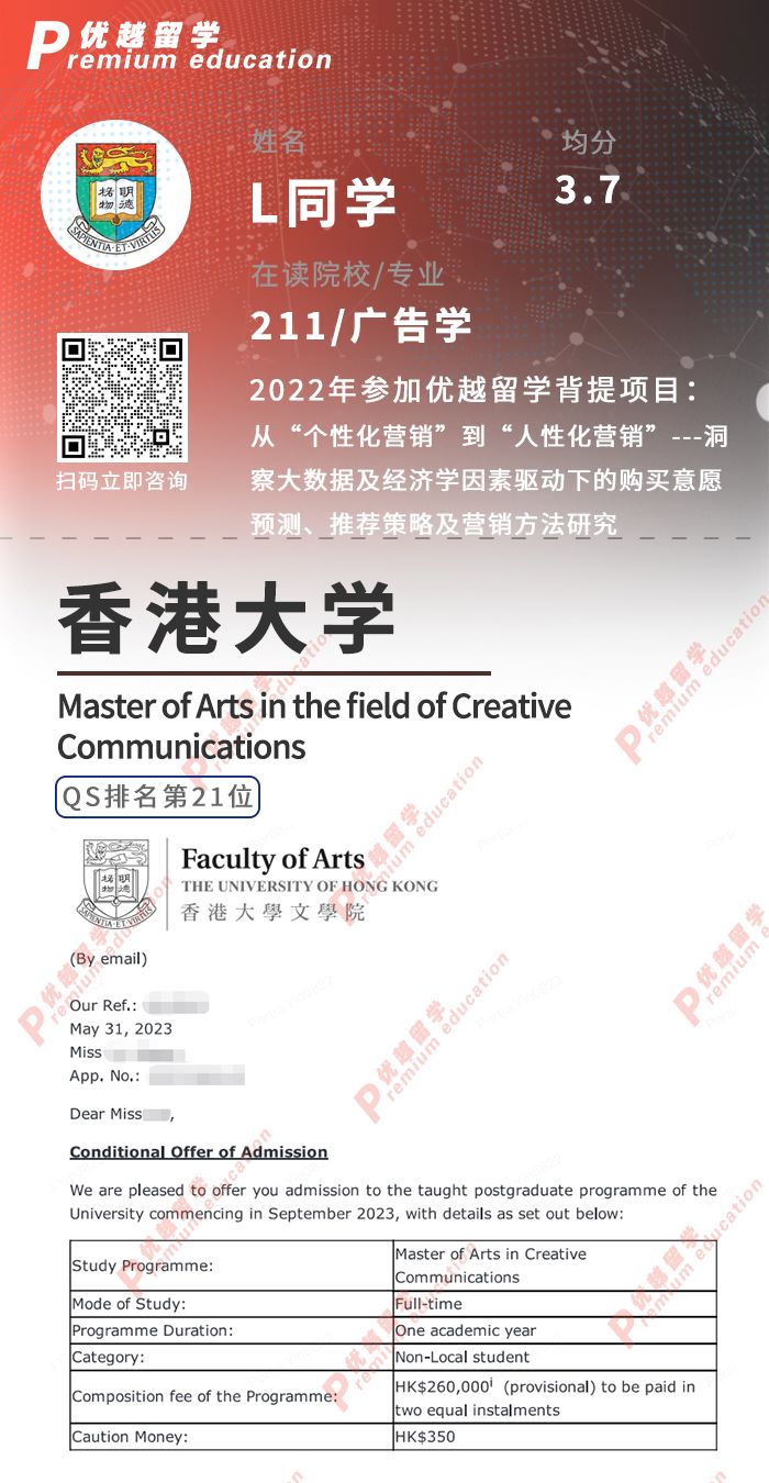 2023offer來襲!恭喜L同學在碩士留學申請中斬獲倫香港大學創意傳播碩士通知書!