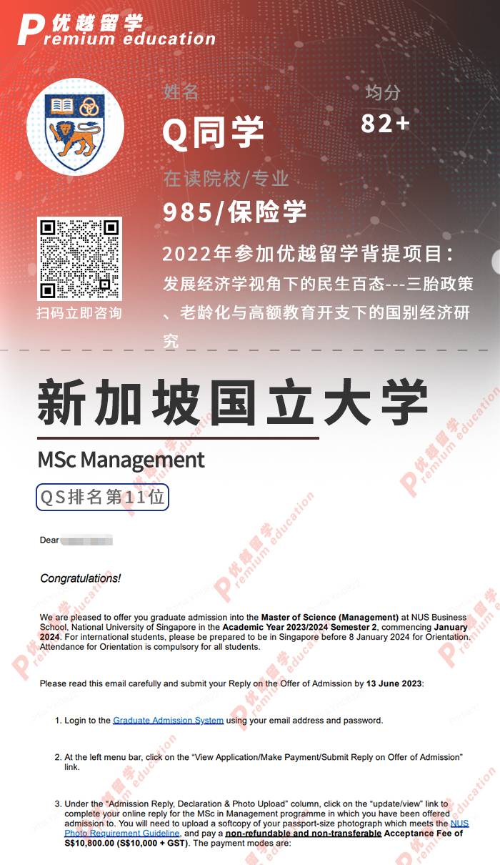 2023offer來襲!恭喜Q同學在碩士留學申請中斬獲新加坡國立大學管理學碩士通知書!