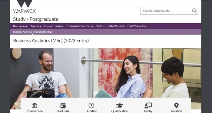 申請人需要擁有英國大學本科的2:1學位或海外大學的同等學位。學校考慮來自各種學位的申請,包括經濟學、商業(yè)、工程學、心理學、地理學、社會學和政治,但該課程需要很強的計算能力和IT統(tǒng)計能力。學校不要求GMAT或GRE成績,但表明一個均衡的分數(700分以上)可能會加強學生的申請。對于中國學生來說,華威大學有自己的院校list,均分要求在80%-89%及以上,具體取決于學校水平。