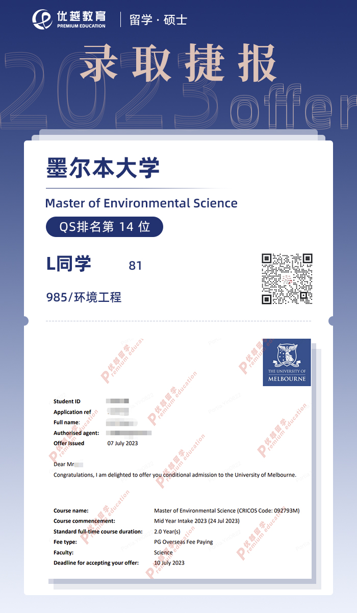 2023offer來襲!恭喜L同學在碩士留學申請中斬獲墨爾本大學環(huán)境科學碩士通知書!