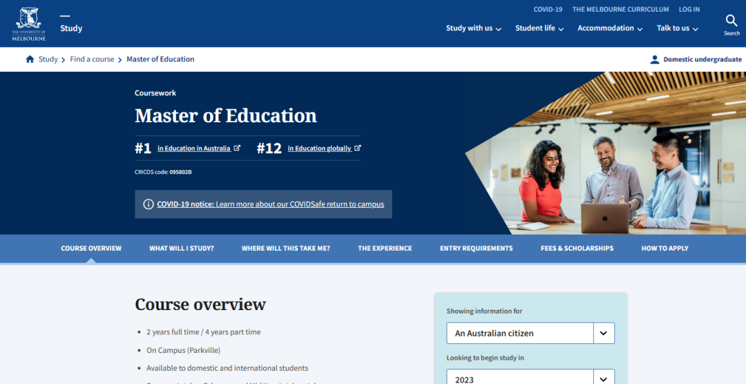 2年制:本科學歷,任何專業可申請。1年制:需要擁有教育學專業的本科學位;或者擁有任意專業學位但申請時已經完成若干研究生科目(這些科目可以等同于墨爾本大學100學分的研究生課程,從而獲得一年學分減免)。對于來自985,211的申請人來說,均分建議達75%+;對于雙非院校的申請人來說,均分建議達80%+。