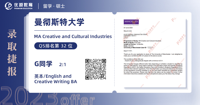 2023offer來襲!恭喜G同學在碩士留學申請中斬獲曼徹斯特大學創意與文化產業碩士通知書!