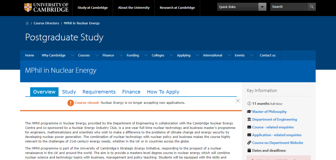該課程由工程系與劍橋核能中心合作提供,并由核能工業俱樂部共同主辦,是一個為期一年的全日制核技術和商業碩士課程。該碩士項目是劍橋大學戰略能源計劃的一部分,旨在響應英國和世界各地核復興的前景。其目的是提供核能碩士學位課程,將核科學和技術主題與商業、管理和政策教學相結合。