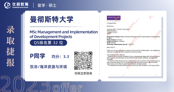 2023offer來襲!恭喜P同學在碩士留學申請中斬獲曼徹斯特大學發展項目管理與實施碩士通知書!