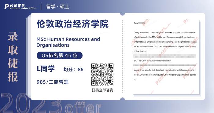 以上是【2023offer(英國碩士): 【倫敦政治經濟學院LSE】人力資源與組織專業】相關的全部內容,查看更多【offer榜單】、【名校案例】相關資訊可前往【優越留學】首頁!世界名校申請,找優越留學!選校定校、申請規劃、文書寫作、背景提升、方案定制一套搞定!點擊【在線咨詢】,優越留學顧問24h在線為您一對一解答!
