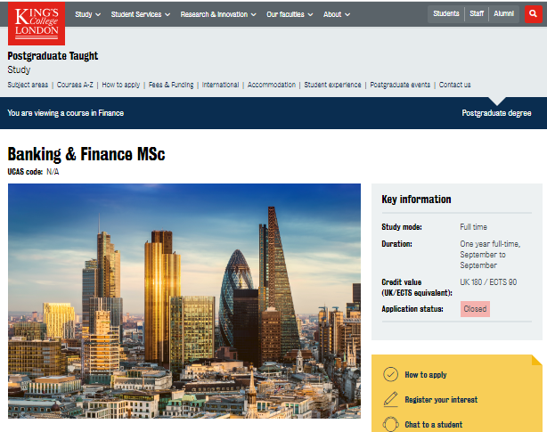 該課程旨在為學生在銀行和金融行業(yè)打造卓越的職業(yè)生涯。探討金融市場和全球銀行業(yè)面臨的挑戰(zhàn),揭示復雜的金融原理和數(shù)據(jù)應用對投資問題的復雜性,透徹了解銀行和金融市場的許多復雜且具有挑戰(zhàn)性的方面,課程專門為學生提供這些基本技能而設計。國王商學院的銀行與金融理學碩士提供全面的金融教育,包括商業(yè)和投資銀行、金融衍生品、風險管理、金融監(jiān)管和行為金融學。