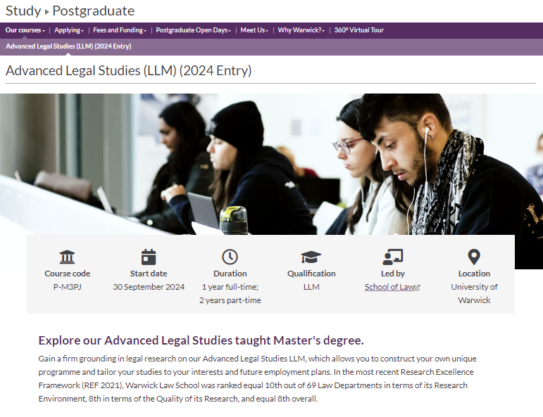 通過高級法律研究法學碩士,學生可以在法律研究方面打下堅實的基礎,在最新的研究卓越框架(REF 2021)中,華威法學院的研究環境在69個法學院中排名第10位,研究質量排名第8位,總體排名第8位。學生可以學習多個法律領域的先進法律知識,獨立研究和政策分析,國內和國際背景下的法律實踐,學術寫作和批判性思維。