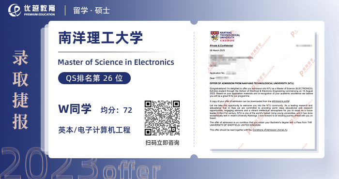 2023offer來襲!恭喜W同學在碩士留學申請中斬獲南洋理工大學電子學碩士通知書!