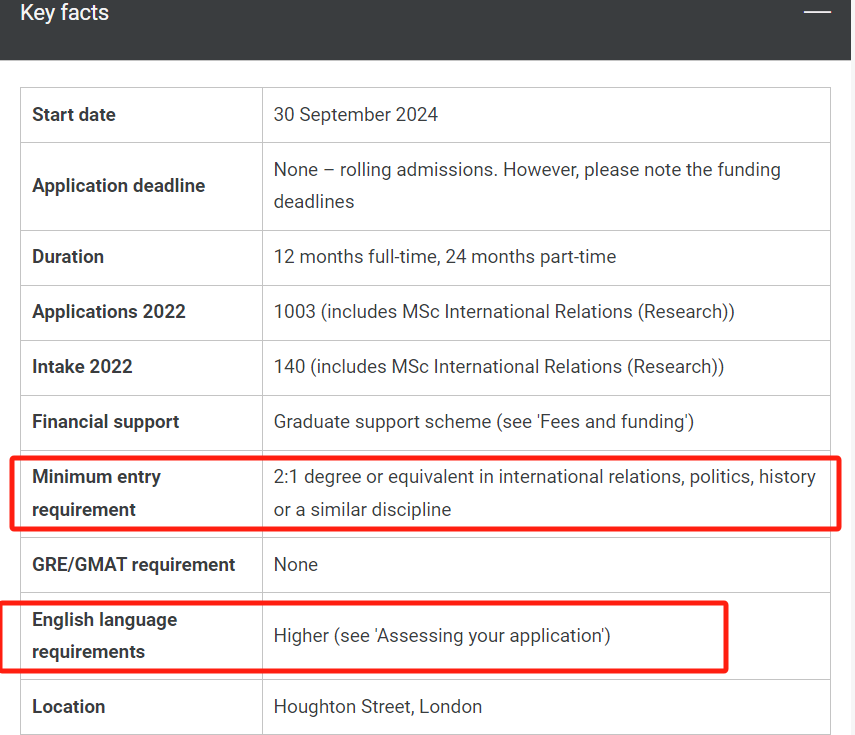 作為社科頂流的LSE,其下國際關系系(IR)-國際關系碩士(MSc International Relations),申請難度極高,去年中國學生申請人數破千,最高僅10%的錄取率。