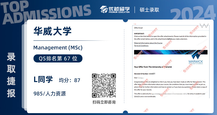 以上是【本期offer榜單:2024英國碩士offer上新! 【華威大學】管理學專業】相關的全部內容,查看更多【offer榜單】、【名校案例】相關資訊可前往【優越留學】首頁!世界名校申請,找優越留學!選校定校、申請規劃、文書寫作、背景提升、方案定制一套搞定!點擊【在線咨詢】,優越留學顧問24h在線為您一對一解答!