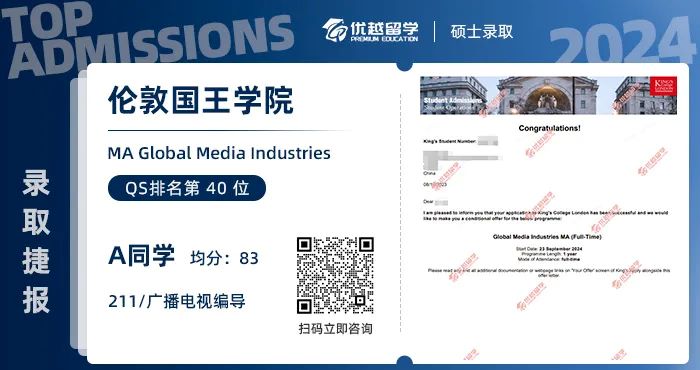 以上是【【倫敦國王學院】211均分83學姐,上岸KCL全球媒體產業碩士】相關的全部內容,查看更多【offer榜單】、【名校案例】相關資訊可前往【優越留學】首頁!世界名校申請,找優越留學!選校定校、申請規劃、文書寫作、背景提升、方案定制一套搞定!點擊【在線咨詢】,優越留學顧問24h在線為您一對一解答!