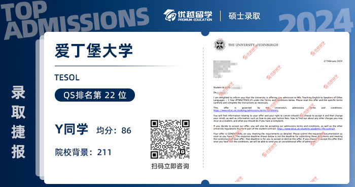 以上是【【愛丁堡大學】211英語專業學姐,2個月高速上岸愛大TESOL!】相關的全部內容,查看更多【offer榜單】、【名校案例】相關資訊可前往【優越留學】首頁!世界名校申請,找優越留學!選校定校、申請規劃、文書寫作、背景提升、方案定制一套搞定!點擊【在線咨詢】,優越留學顧問24h在線為您一對一解答!