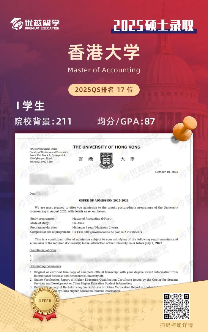 以上是【25fall提前批offer上新!香港大學已發會計碩士offer 】相關的全部內容,查看更多【offer榜單】、【名校案例】相關資訊可前往【優越留學】首頁!世界名校申請,找優越留學!選校定校、申請規劃、文書寫作、背景提升、方案定制一套搞定!點擊【在線咨詢】,優越留學顧問24h在線為您一對一解答!