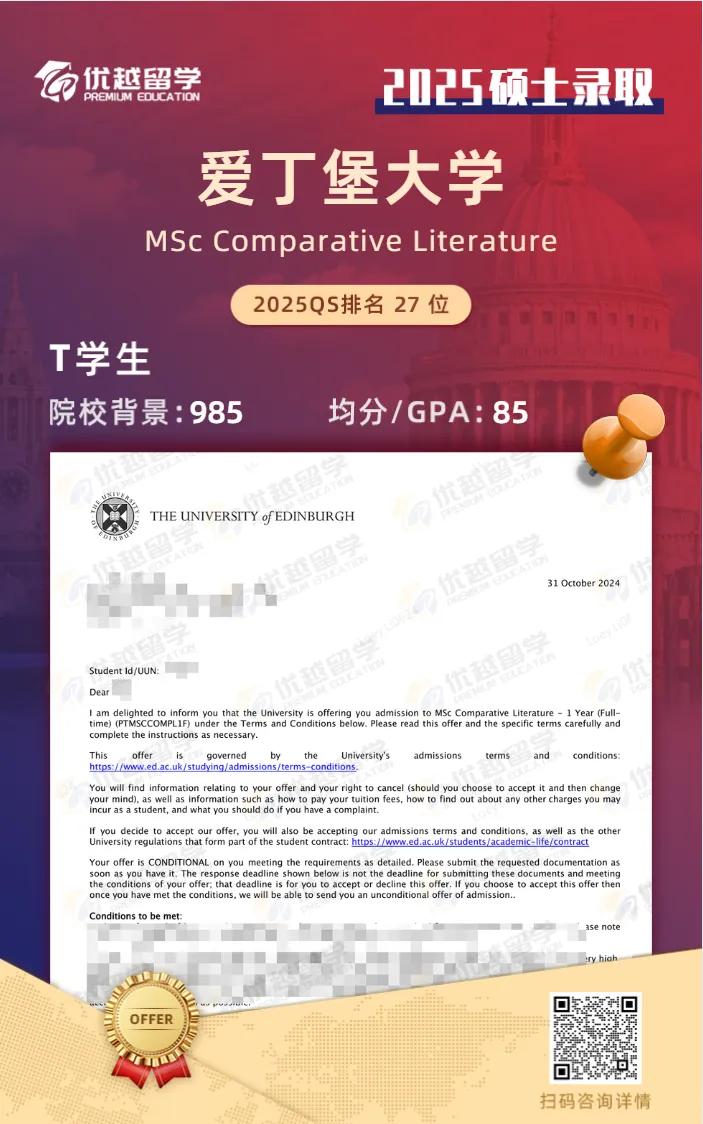 恭喜優越學員碩士研究生申請首戰告捷,拿下愛丁堡大學比較文學碩士offer。接下來,就跟優越君一起看看,T同學的上岸歷程~