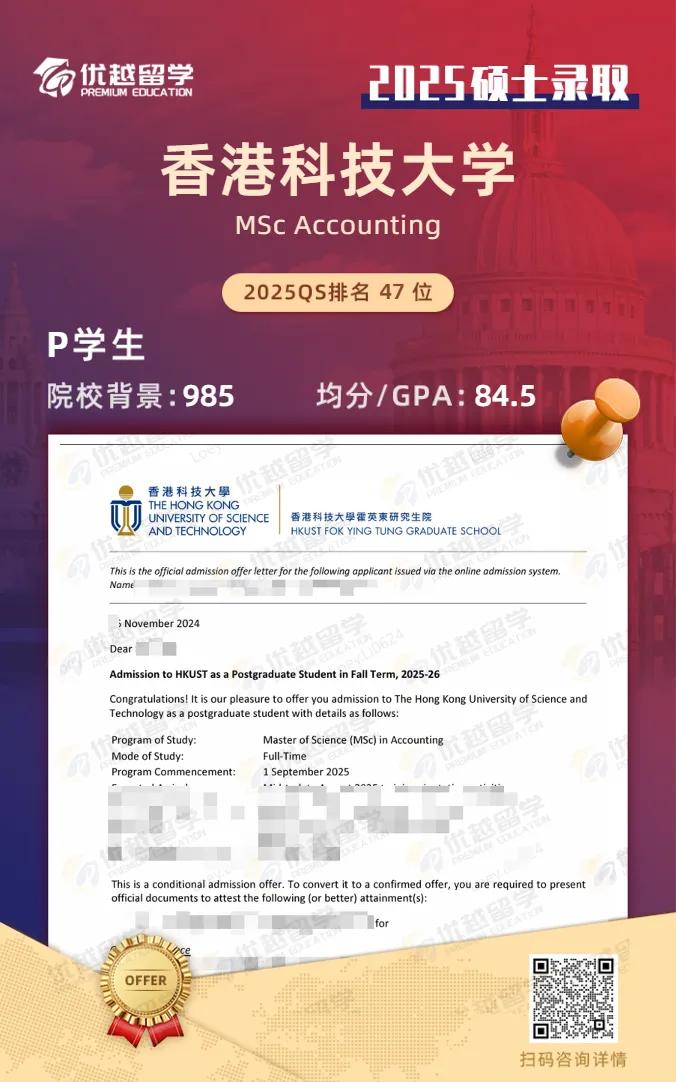 以上是【25fall港前三大學放榜:985本科錄取【香港科技大學】會計碩士】相關的全部內容,查看更多【offer榜單】、【名校案例】相關資訊可前往【優越留學】首頁!世界名校申請,找優越留學!選校定校、申請規劃、文書寫作、背景提升、方案定制一套搞定!點擊【在線咨詢】,優越留學顧問24h在線為您一對一解答!