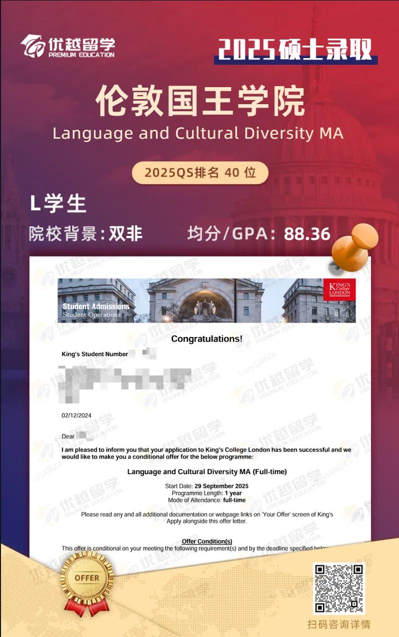 以上是【25fall英國留學機構offer:雙非錄取【KCL倫敦國王學院】語言和文化多樣性專業】相關的全部內容,查看更多【offer榜單】、【名校案例】相關資訊可前往【優越留學】首頁!世界名校申請,找優越留學!選校定校、申請規劃、文書寫作、背景提升、方案定制一套搞定!點擊【在線咨詢】,優越留學顧問24h在線為您一對一解答!