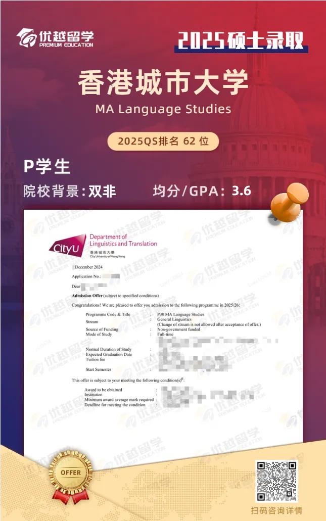 以上是【25fall香港碩士offer+1!雙非錄取【香港城市大學(xué)】語言研究專業(yè)】相關(guān)的全部?jī)?nèi)容,查看更多【offer榜單】、【名校案例】相關(guān)資訊可前往【優(yōu)越留學(xué)】首頁!世界名校申請(qǐng),找優(yōu)越留學(xué)!選校定校、申請(qǐng)規(guī)劃、文書寫作、背景提升、方案定制一套搞定!點(diǎn)擊【在線咨詢】,優(yōu)越留學(xué)顧問24h在線為您一對(duì)一解答!