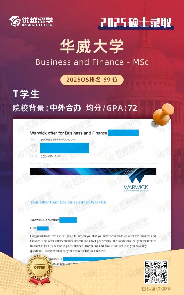 以上是【25fall英國(guó)留學(xué)中介offer上新!【華威大學(xué)】商業(yè)與金融碩士錄取】相關(guān)的全部?jī)?nèi)容,查看更多【offer榜單】、【名校案例】相關(guān)資訊可前往【優(yōu)越留學(xué)】首頁(yè)!世界名校申請(qǐng),找優(yōu)越留學(xué)!選校定校、申請(qǐng)規(guī)劃、文書(shū)寫(xiě)作、背景提升、方案定制一套搞定!點(diǎn)擊【在線咨詢】,優(yōu)越留學(xué)顧問(wèn)24h在線為您一對(duì)一解答!
