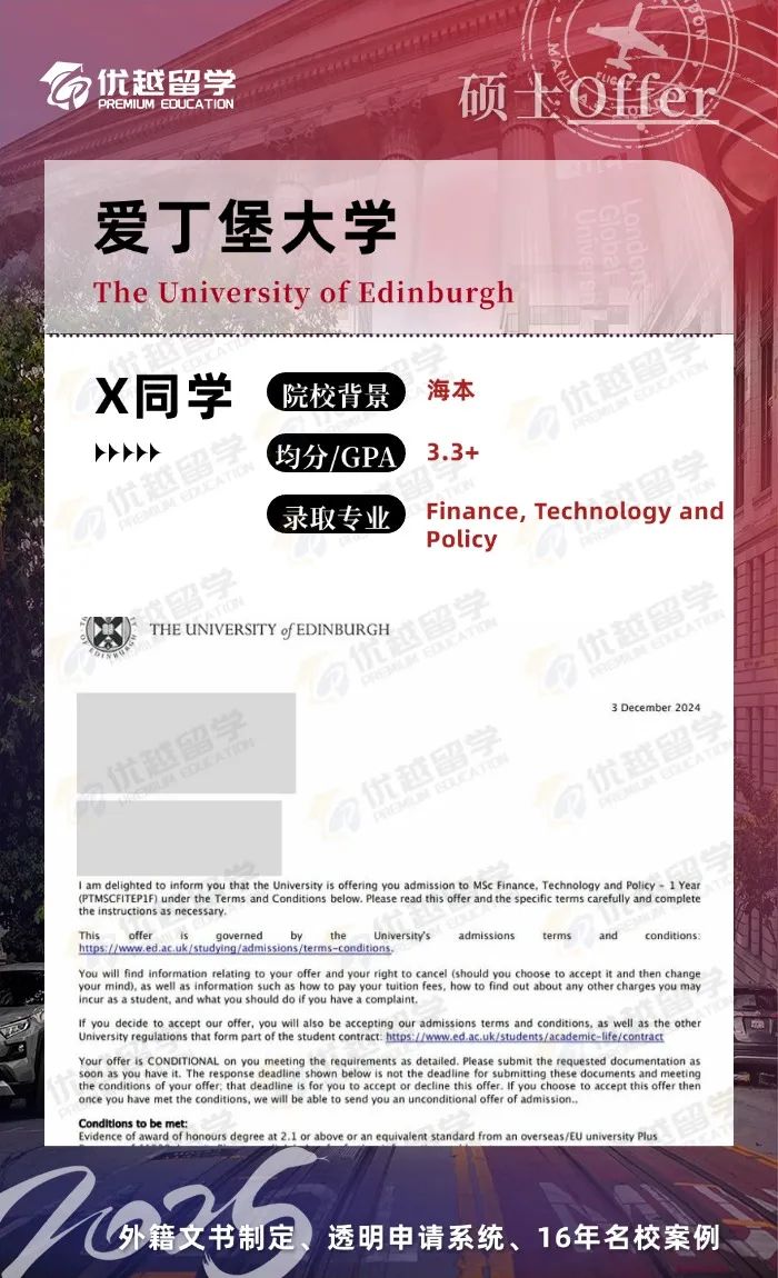 以上是【25fall英國留學碩士offer:優越再添一枚【愛丁堡大學】金融、技術和政策專業】相關的全部內容,查看更多【offer榜單】、【名校案例】相關資訊可前往【優越留學】首頁!世界名校申請,找優越留學!選校定校、申請規劃、文書寫作、背景提升、方案定制一套搞定!點擊【在線咨詢】,優越留學顧問24h在線為您一對一解答!